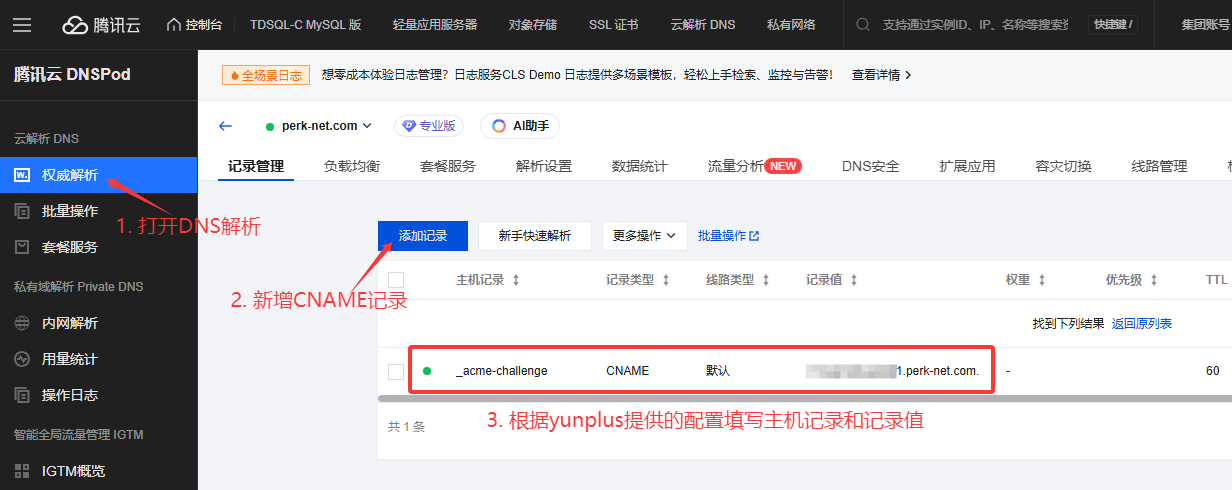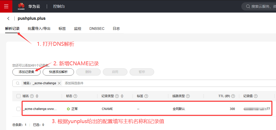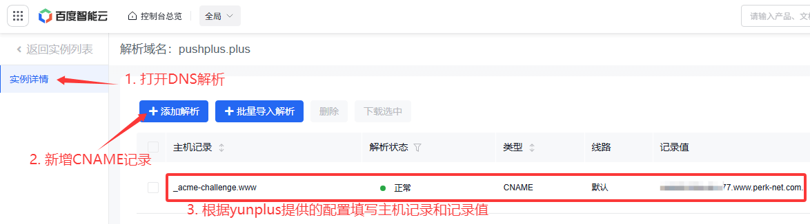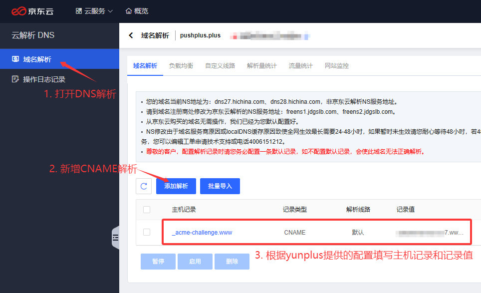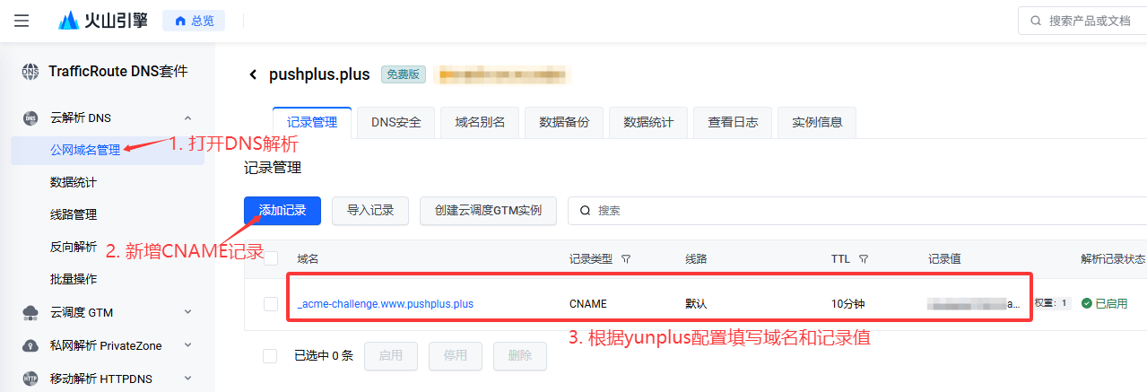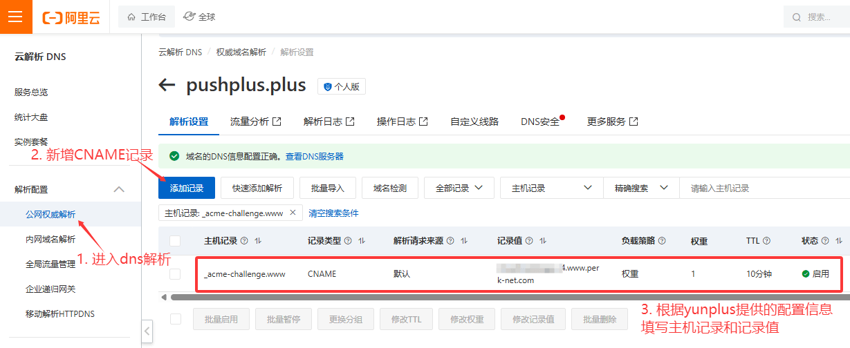 - 新增一条CNAME的解析记录,根据yunplus页面上给出的配置信息进行填写主机名和记录值。